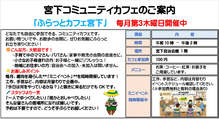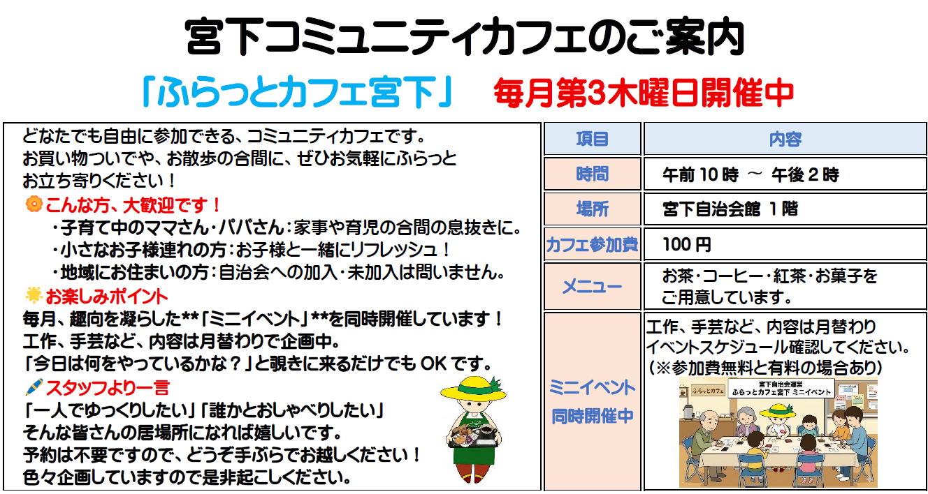 | ふらっとカフェ宮下 | 4月16日(木) | 10:00~14:00 | 自治会館1F |