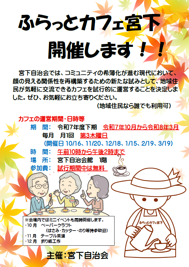 ふらっとカフェ宮下 | 11月20日(木) | 10:00~14:00 | 自治会館1F |